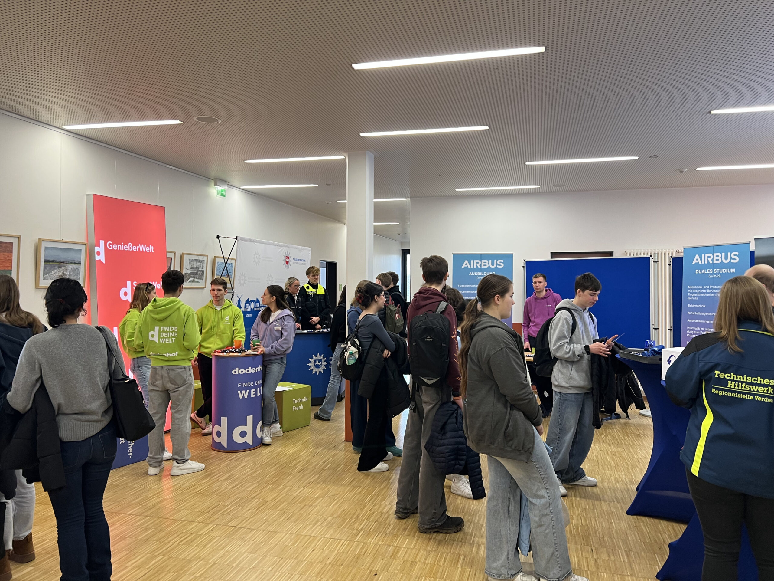 Am vergangenen Donnerstag, den 26. März 2026, fand am Gymnasium Ottersberg der 1. Berufsinformationstag statt. Bei diesem hatten die Schüler*innen der 9. und 10. Klassen die Möglichkeit sich in Vorträgen über eine Vielzahl an Berufen zu informieren. Zu diesem Tag wurden kleine und große Unternehmen aus der Region eingeladen. Der Tag begann für die Schüler*innen mit einem Vortrag von Frau Becker von der Agentur für Arbeit zum Thema, was man bei der Berufswahl alles berücksichtigen solle. Anschließend fanden fünf Blöcke mit Vorträgen statt, in die sich die Schüler*innen nach ihren Interessen einwählen konnten. Das vielfältige Angebot reichte von Airbus und Mercedes über die Tierklinik, das Finanzamt bis zur Flora-Apotheke und noch vielem mehr. Im Anschluss an die Vorträge hatten die Schüler*innen der Möglichkeit den Referenten direkt Fragen zu stellen. Abgerundet wurde die Veranstaltung durch Informationsstände, die einige Firmen in dem Foyer aufgebaut hatten.