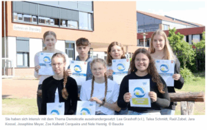 Seit diesem Schuljahr gibt es an unserer Schule ein neues Fach für die Schülerinnen und Schüler ab den 8. Klassen. Im Wahlpflichunterricht setzen sie sich näher mit den Elementen und den Funktionsweisen der Demokratie auseinander. Dies erfolgt auch auf kreative Art und Weise und beim Eurpäischen Wettbewerb konnten sogar zwei Landessiege erreicht werden. Dies blieb auch nicht der Presse verborgen und so erschien in der Kreiszeitung am 22.05.25 folgender Artikel: